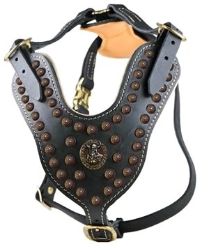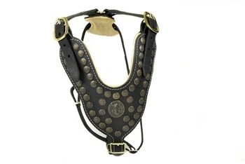 Een stoer en zeer hoogwaardig hondentuig voor de grotere hondenrassen. De grote borstplaat is versierd met messing studs en een grote gehamerde Viking munt. Dit hondenharnas is geschikt voor een echte krijgshond ! De borstplaat is gemaakt van dik volnerf leer, dat betekent dat het leer niet wordt geschuurd, waardoor de nerf en het natuurlijke beeld intact blijft.