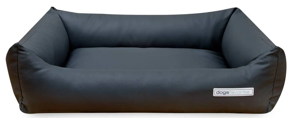 Een fraaie donkergrijze kunstleren hondenmand die goed geschikt is voor honden die graag tegen een rand aan liggen. Alle zijkanten en de bodem zijn met risten aan elkaar bevestigd, waardoor elk deel separaat gewassen kan worden en nabesteld kan worden. Door deze constructie van deze bijzondere hondenmand wordt het onderhoud vereenvoudigd en de levensduur verlengd.