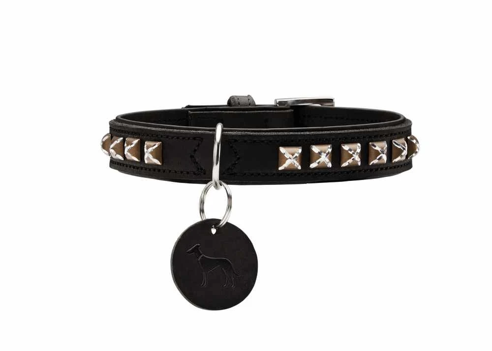 Deze strakke hondenhalsband is gemaakt van 100% hoogwaardig rundleder. De halsband word gekenmerkt door strakke lijnen, een metalen D ring en sluiting waarbij het ontwerp duidelijk is geïnspireerd door Scandinavisch design. Een echte blikvanger zijn de piramidevormige studs. De halsband is gevoerd met zwart leer.