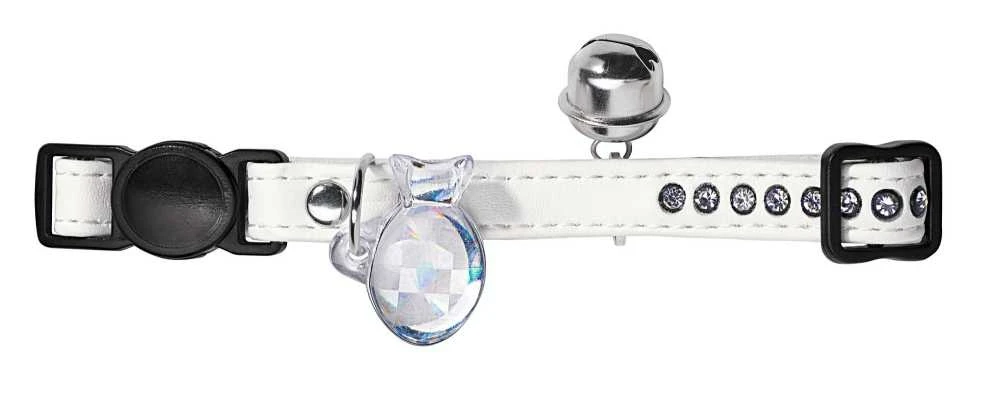 Dit is een witte kattenhalsband die is gemaakt van onderhoudsarm kunstleer. De halsband is gedecoreerd met stras steentjes. De halsband is voorzien van een veiligheidssluiting. Dit zorgt ervoor dat de sluiting openspringt als de kat ergens aan blijft haken. De halsband is traploos verstelbaar en voorzien van een belletje en een adreshangertje.