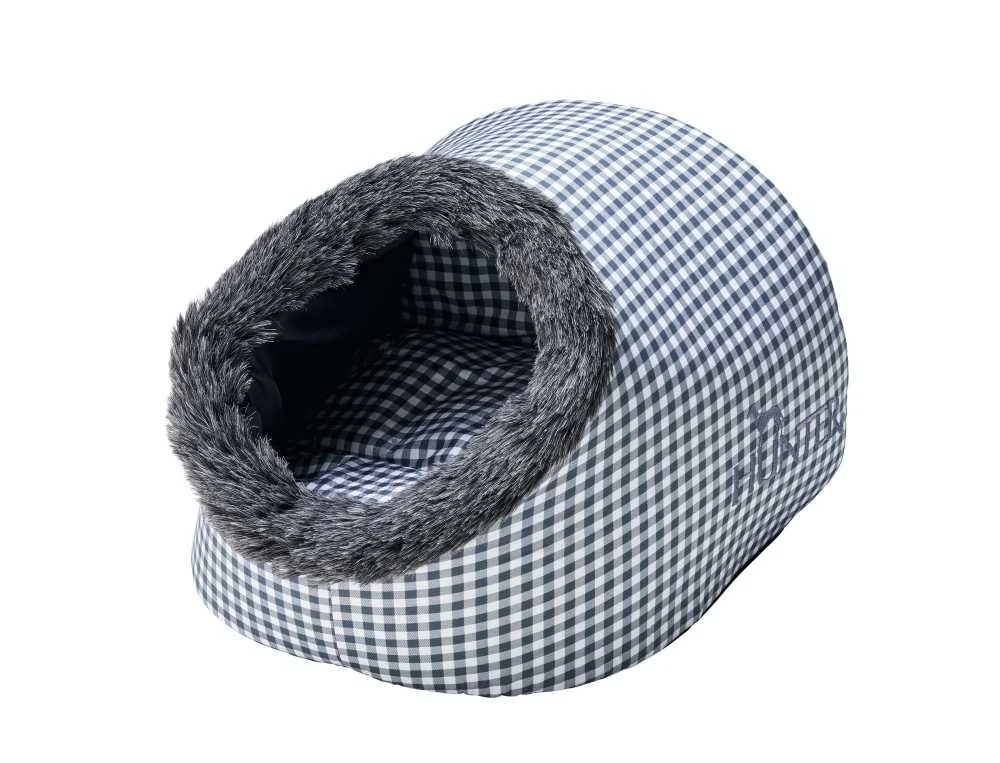 Katten houden ervan om zich te verstoppen. Deze kattenmand is precies daarvoor ontworpen en biedt de kat een knusse en overdekte ligplaats. Deze kattenmand is uitgevoerd in een klassieke grijze ruit. Een leuk detail is de pluche rand rondom de opening.
