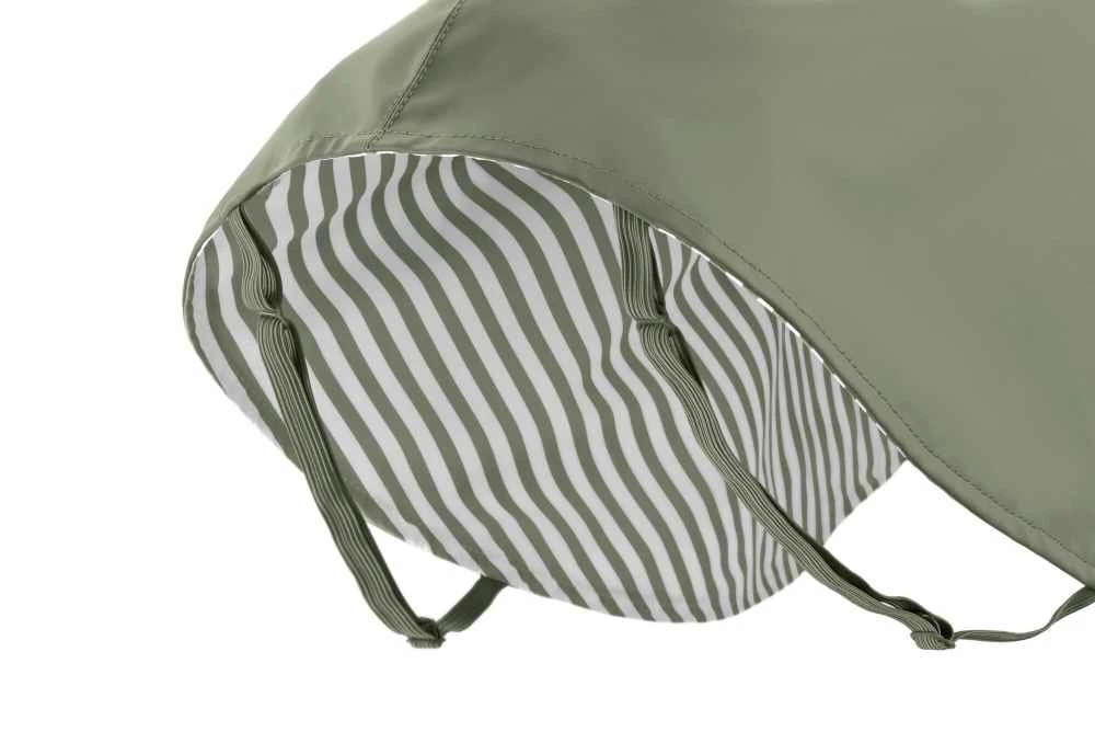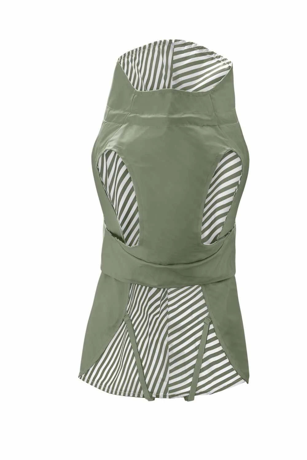 De nek is individueel verstelbaar met een elastisch koord. De hondenregenjas is in een handomdraai individueel gesloten door middel van een brede klittenband. Deze wordt op de rug vastgemaakt en is in een mum van tijd traploos te verstellen als tijdens een vochtige wandeling blijkt dat jas iets te breed of te krap is. De jas is heel comfortabel om te dragen, mede door de aantrekkelijke gestreepte voering.