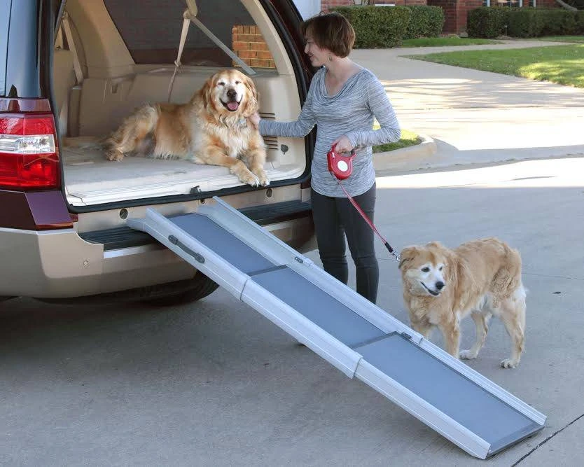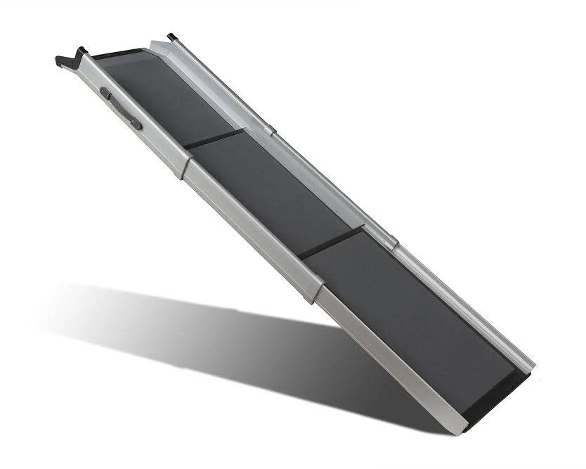 Deze hondenloopplank is gemaakt van superlicht aluminium en weegt slechts 6,35 kilo. De loopplank is 3 delig inschuifbaar en daarmee zeer compact.