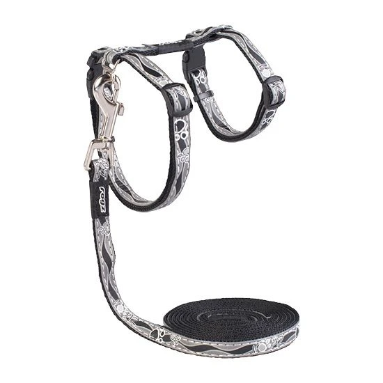Dit is een modern zwart kattentuigje van 100% polyester. De reflecterende opdruk van PU kunstleer zorgt voor extra zichtbaarheid bij slecht licht. Het tuigje is voorzien van twee veiligheidssluitingen: Rogz ontwikkelde de ‘break away safety buckle’. Dit zorgt ervoor dat de sluiting openspringt als de kat ergens aan blijft haken. Het mooie en unieke aan deze sluiting is dat u zelf de belastbaarheid kunt instellen, om te voorkomen dat het kattentuig te snel openspringt. Wel zal het tuigje altijd open blijven springen als er teveel druk op de sluiting wordt uitgeoefend.