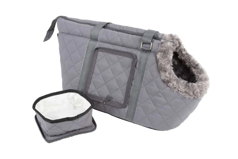 Een mooie en praktische hondendraagtas, in het grijs uitgevoerd, waarmee u uw hond veilig kunt meedragen. De draagtas heeft een rits over de hele lengte van de tas, zodat u de hond er gemakkelijk in- en uit kunt halen. De neklijn is uitgesneden zodat uw huisdier de kop naar buiten kan steken en goed contact met de buitenwereld kan houden.