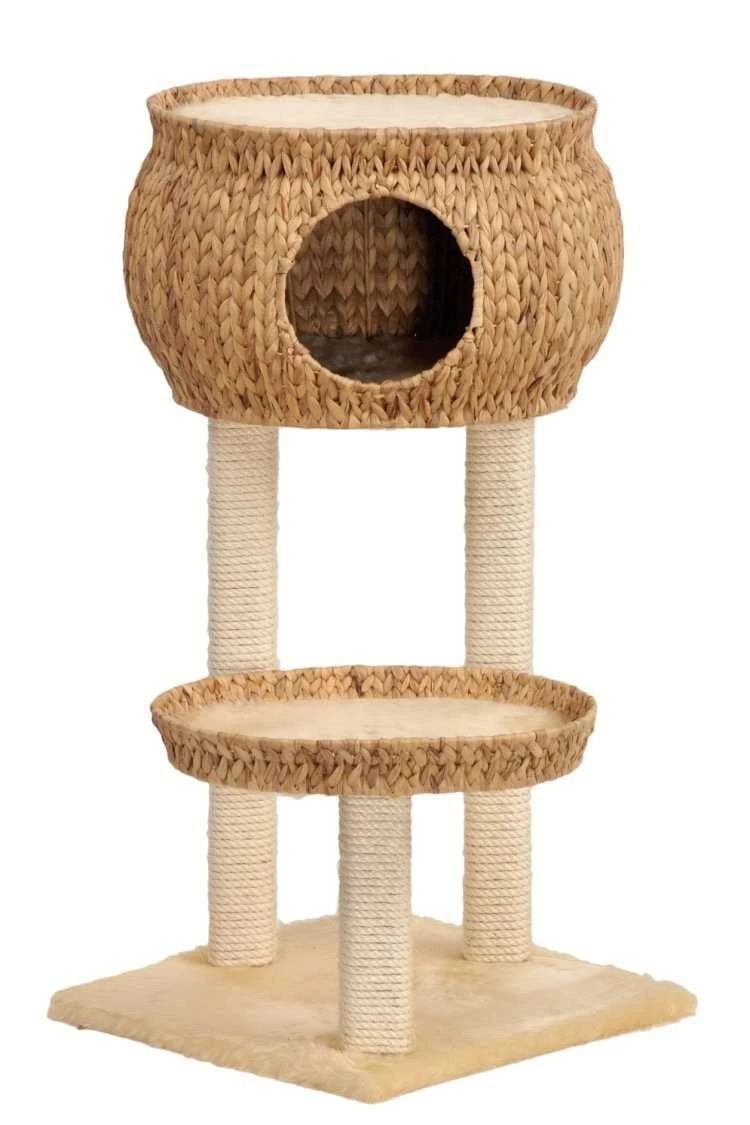 Een stabiel en comfortabel kattenhuis. Katten vinden het heerlijk om te klimmen en om de omgeving te bekijken. Deze krabpaal heeft drie massief houten palen met sisaltouw. Het kattenhuis heeft verder een ruim verhoogd plateau van gewoven waterhyacint. Er is ook een overdekte rust- of slaapplaats, dat fraai is gemaakt van gevlochten waterhyacint, met nog een rustplaats aan de bovenzijde.