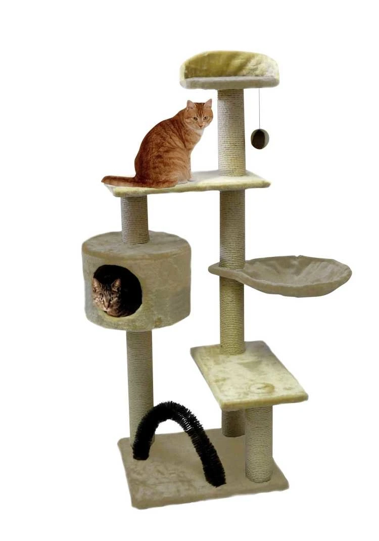 Een beige krabpaal die u veel mogelijkheden biedt. Zo kan de kat naar hartelust de nagels krabben want de krabpaal heeft drie palen met sisaltouw. Verder zijn er diverse ligplaatsen en een hangmand. Ook is er een leuke ronde overdekte rustplaats. Alle rustplaatsen zijn bedekt met beige pluche.