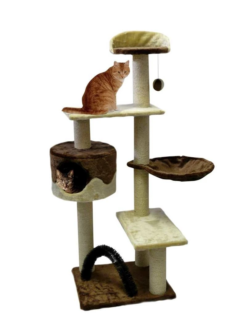 Een bruin & beige krabpaal die u veel mogelijkheden biedt. Zo kan de kat naar hartelust de nagels krabben want de krabpaal heeft drie palen met sisaltouw. Verder zijn er diverse ligplaatsen en een hangmand. Ook is er een leuke ronde overdekte rustplaats. Alle rustplaatsen zijn bedekt met beige of beige pluche.