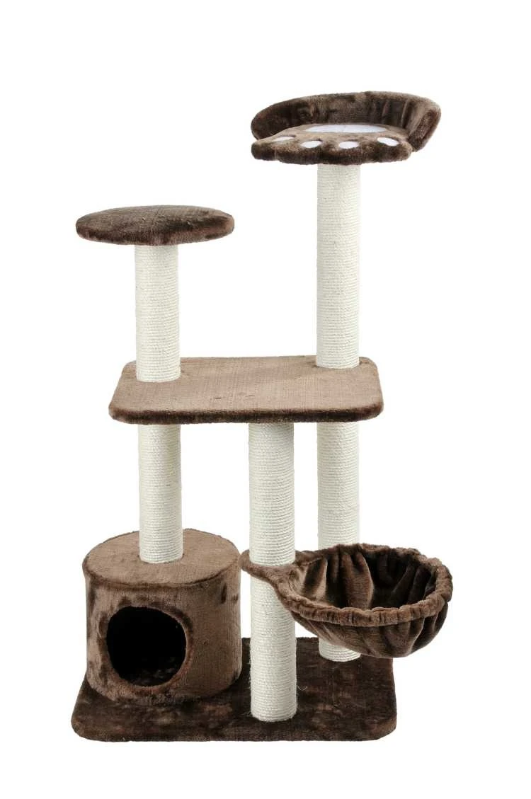 Een bruine krabpaal met diverse mogelijkheden voor de kat. Zo kan de kat naar hartelust de nagels krabben want de krabpaal heeft drie palen met sisaltouw. Verder zijn er verschillende ligplaatsen op diverse niveau’s en een hangmandje. Ook is er een ronde overdekte rustplaats.